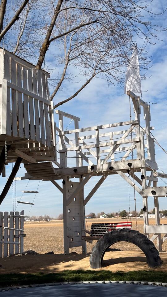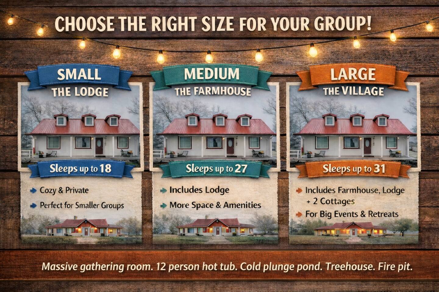 Gather your crew and escape to this charming, 100-year-old farmhouse, renovated for serious fun! With the treehouse with a bed, safely 9 feet up. 12-person hot tub, cold plunge pond, fire pit, trampoline, swings, climbing wall. The 1300 sq ft gathering room is perfect for wedding groups, reunions, retreats, or team getaways. Surrounded by open fields, sunsets, and songbirds. Customized quotes based on group size and event. Less than 18 or more than 41 guests, we have a lodging plan for you.