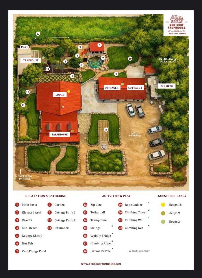 Guest have access to outside areas, basement apartment, bunk-rooms, activity room, farmhouse, loft. Patio behind bungalows is private for the bungalow guests. All indoor spaces are private. Foyer laundry, parking lot, hot tub, cold, plunge pond, mini beach, fire pit are shared spaces. Sleeps 35 total. 1350 ft.² of multi-purpose space + 3500 other areas. 2 walls of windows, tables and chairs for 46, DJ station, dance floor, 2 microphones, karaoke, 7 large screen smart TVs, Cabinets of games, Bluetooth Sound system, AV help, venue host onsite, yard games, plunge pond with waterfall, 2 foot deep beach / sandbox with box of toys, swim spa/hot tub for 12, gas fire pit, AC/heating, Indoor and outdoor seating and venue areas, ping-pong, in ground trampoline, tetherball, hammack, 3 kitchens.