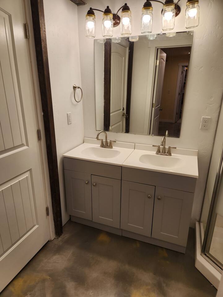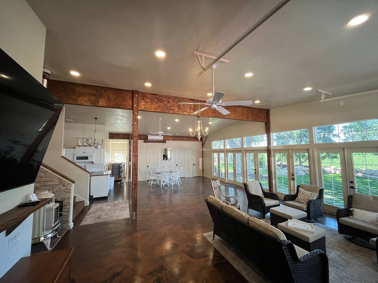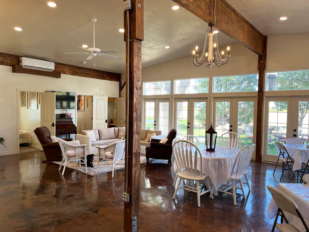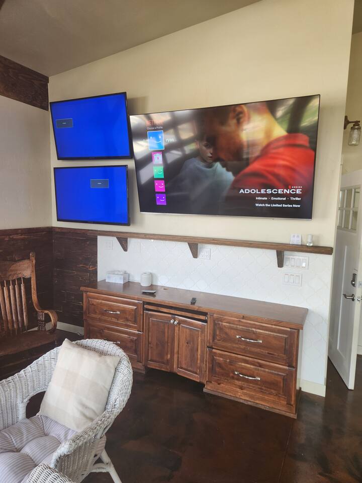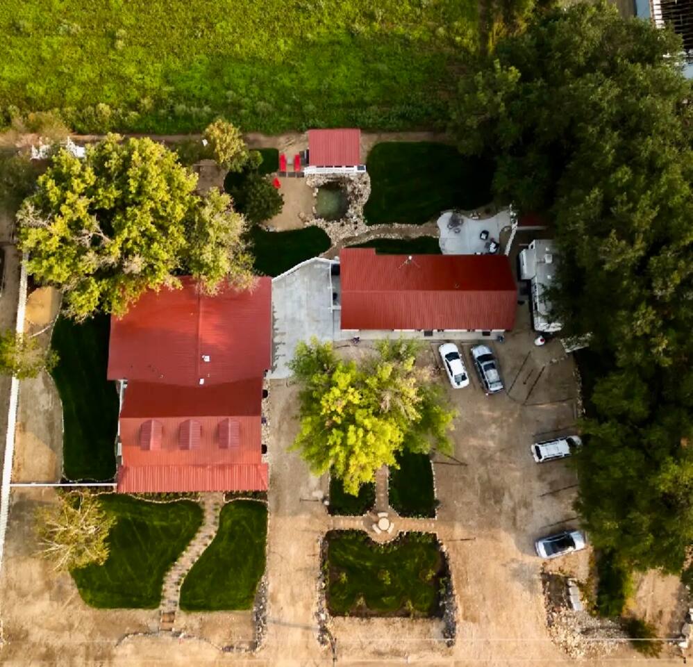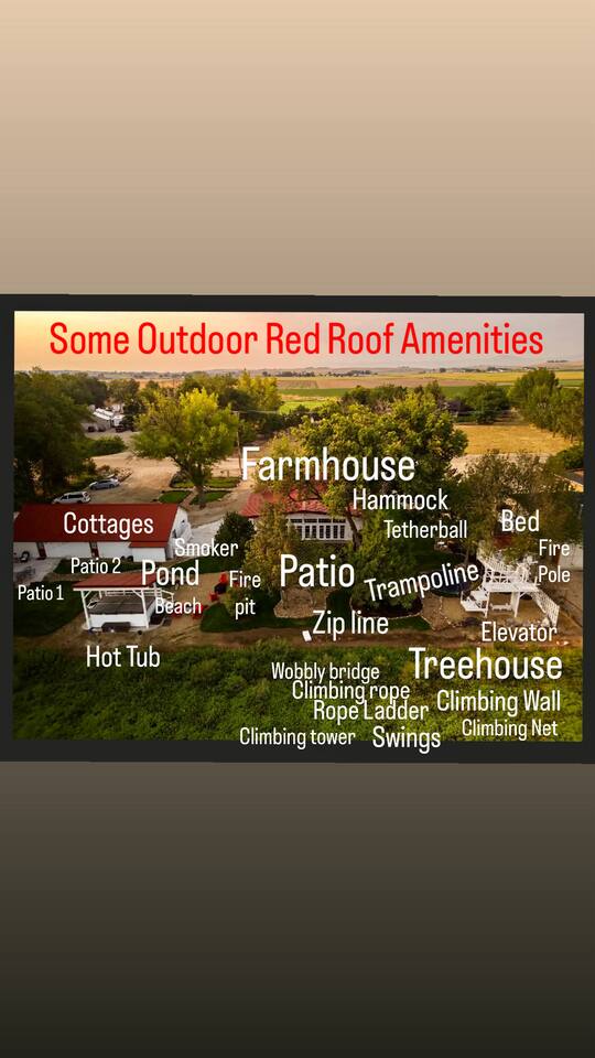 Downstairs area-4 bedrooms sleeps 10 with access to 2 Bathrooms. The beds of 3 rooms can be set as twin extra long or together as kings. Also has a full size kitchen with small open concept family room. Main Level- large 1350 sqf. activity, dining, dancing, karaoke, gaming, mingling, celebration room. Comes with seating/ dining for 40, a small serving kitchen and 1 bathroom. 4 small bunkrooms with 2 twins XL each sleeps 8. Small swimming pond with beach, 12 person swim spa, in ground trampoline, tetherball, and lots of outdoor fun. Meant to be a smaller more affordable listing for groups. It is in the rear of the redroof farmhouse house which if included with the lodge would sleep 27. There are also 2 bungalows that can be added to the reservation for an additional booking fee. The redroof farmhouse can be added at anytime. Total 33 beds available on site. + RV hookups. Hosts available onsite.