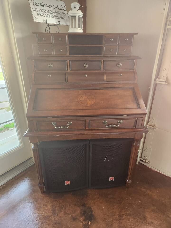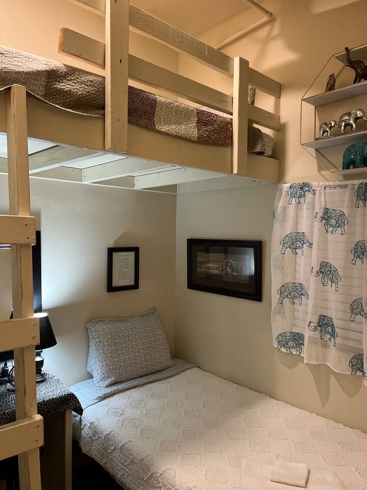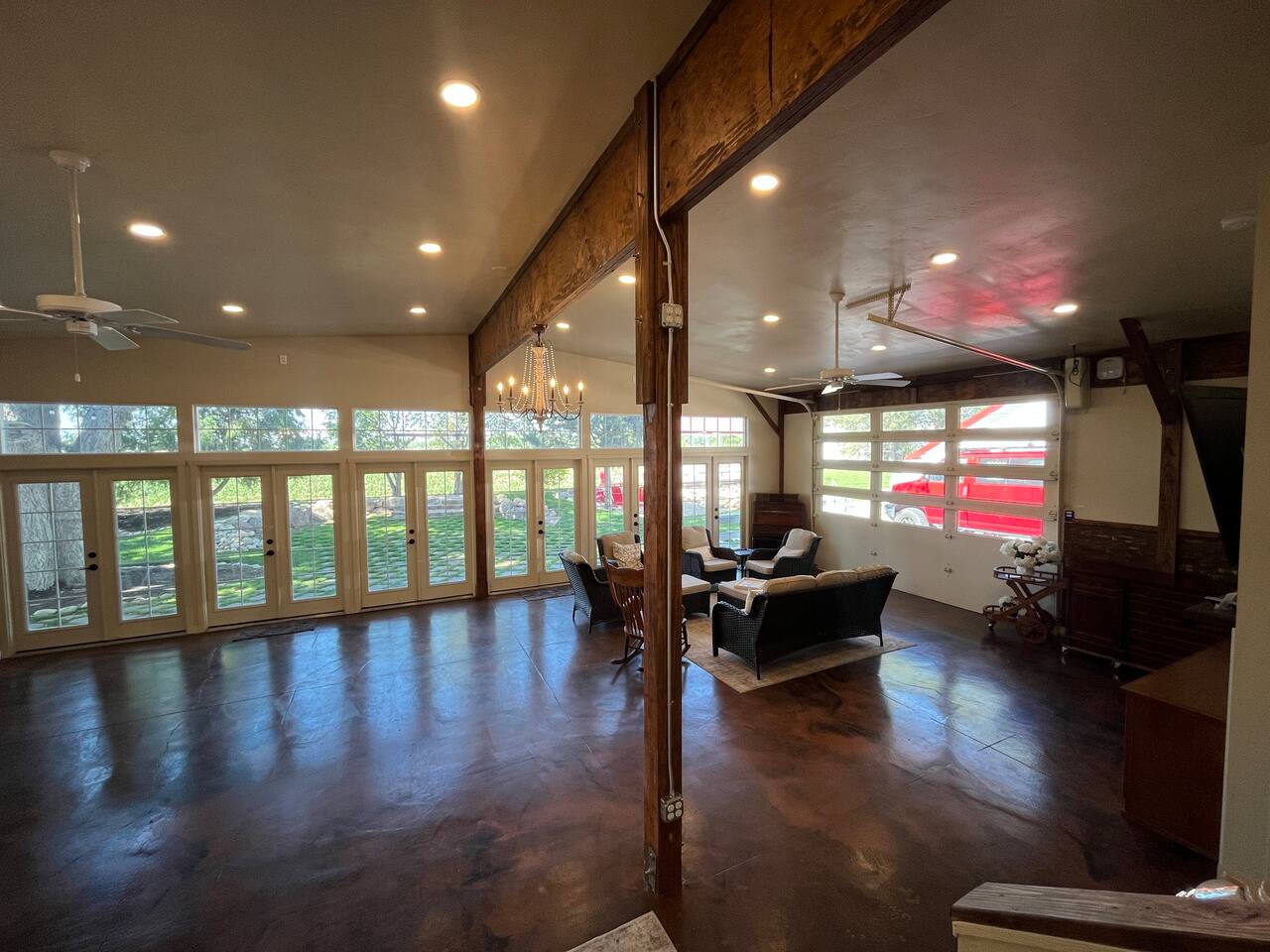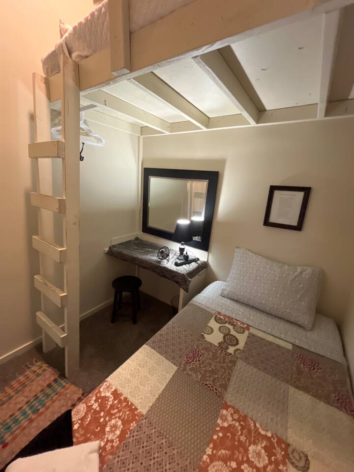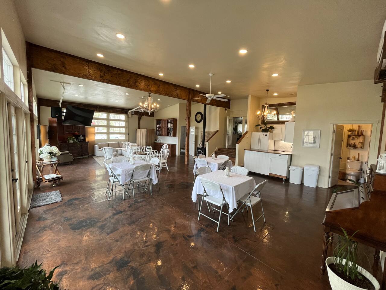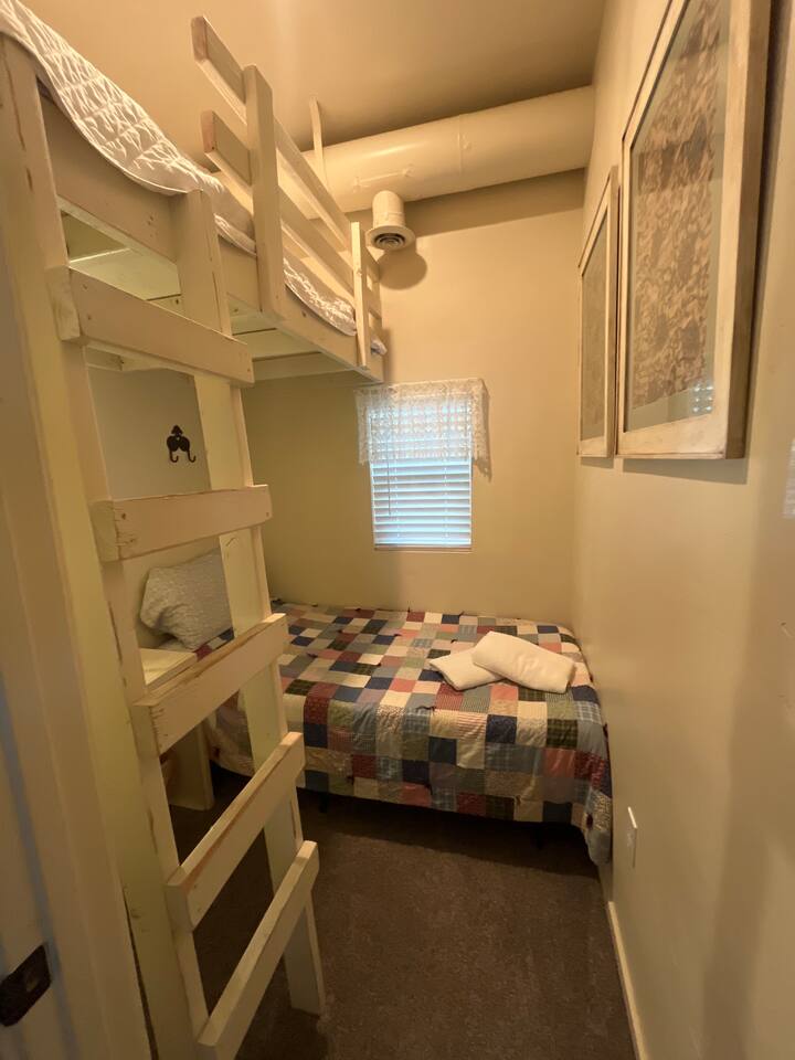 Downstairs area-4 bedrooms sleeps 10 with access to 2 Bathrooms. The beds of 3 rooms can be set as twin extra long or together as kings. Also has a full size kitchen with small open concept family room. Main Level- large 1350 sqf. activity, dining, dancing, karaoke, gaming, mingling, celebration room. Comes with seating/ dining for 40, a small serving kitchen and 1 bathroom. 4 small bunkrooms with 2 twins XL each sleeps 8. Small swimming pond with beach, 12 person swim spa, in ground trampoline, tetherball, and lots of outdoor fun. Meant to be a smaller more affordable listing for groups. It is in the rear of the redroof farmhouse house which if included with the lodge would sleep 27. There are also 2 bungalows that can be added to the reservation for an additional booking fee. The redroof farmhouse can be added at anytime. Total 33 beds available on site. + RV hookups. Hosts available onsite.